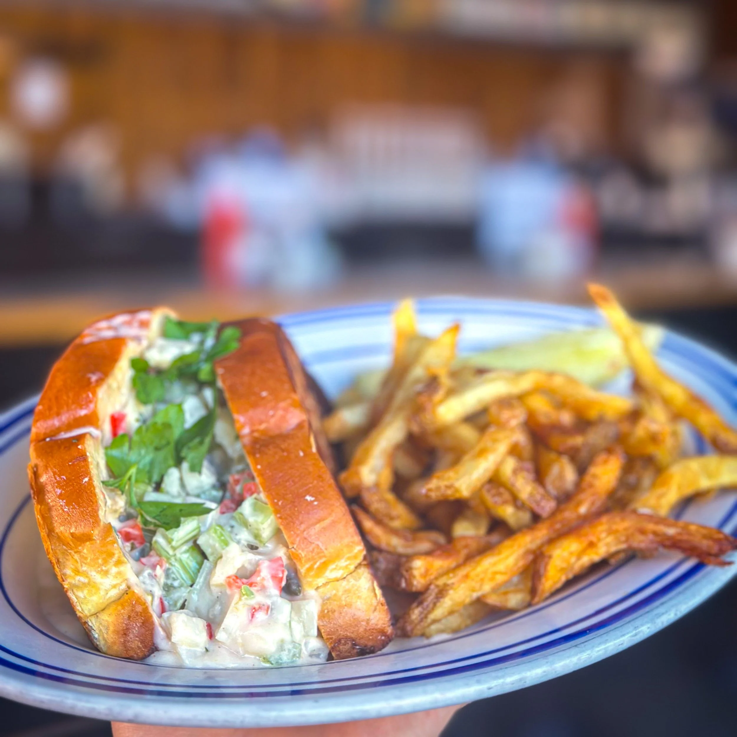 Heart of palm marinated in rice vinegar-miso-nori blend, heated in buttery margarine, topped creamy tarragon-caper–minced red pepper-celery salad and served on a New England style bun with fries and a pickle spear
