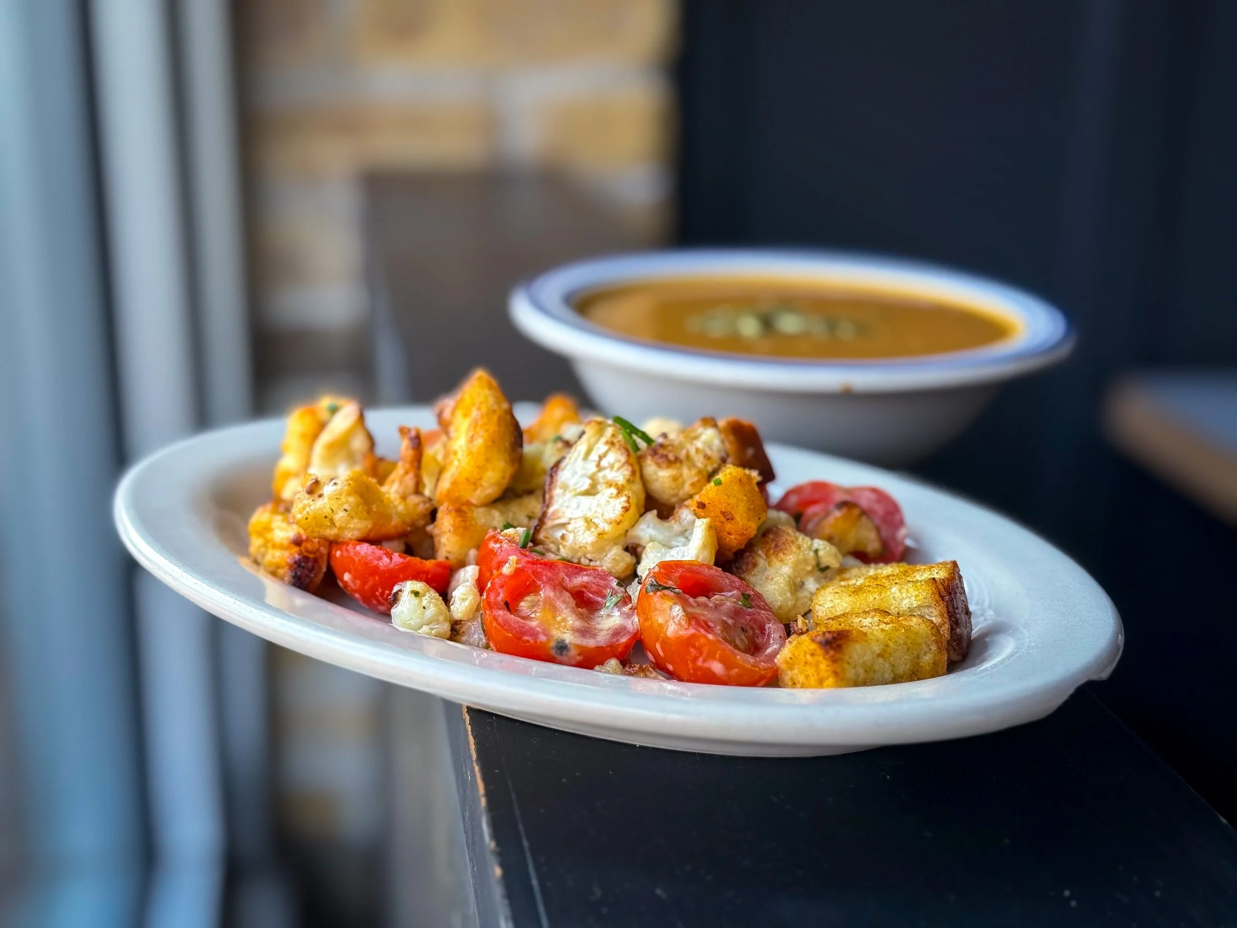 Hand torn croutons, tossed with marinated tomatoes, shallots and roasted cauliflower. dressed with a dijon dressing