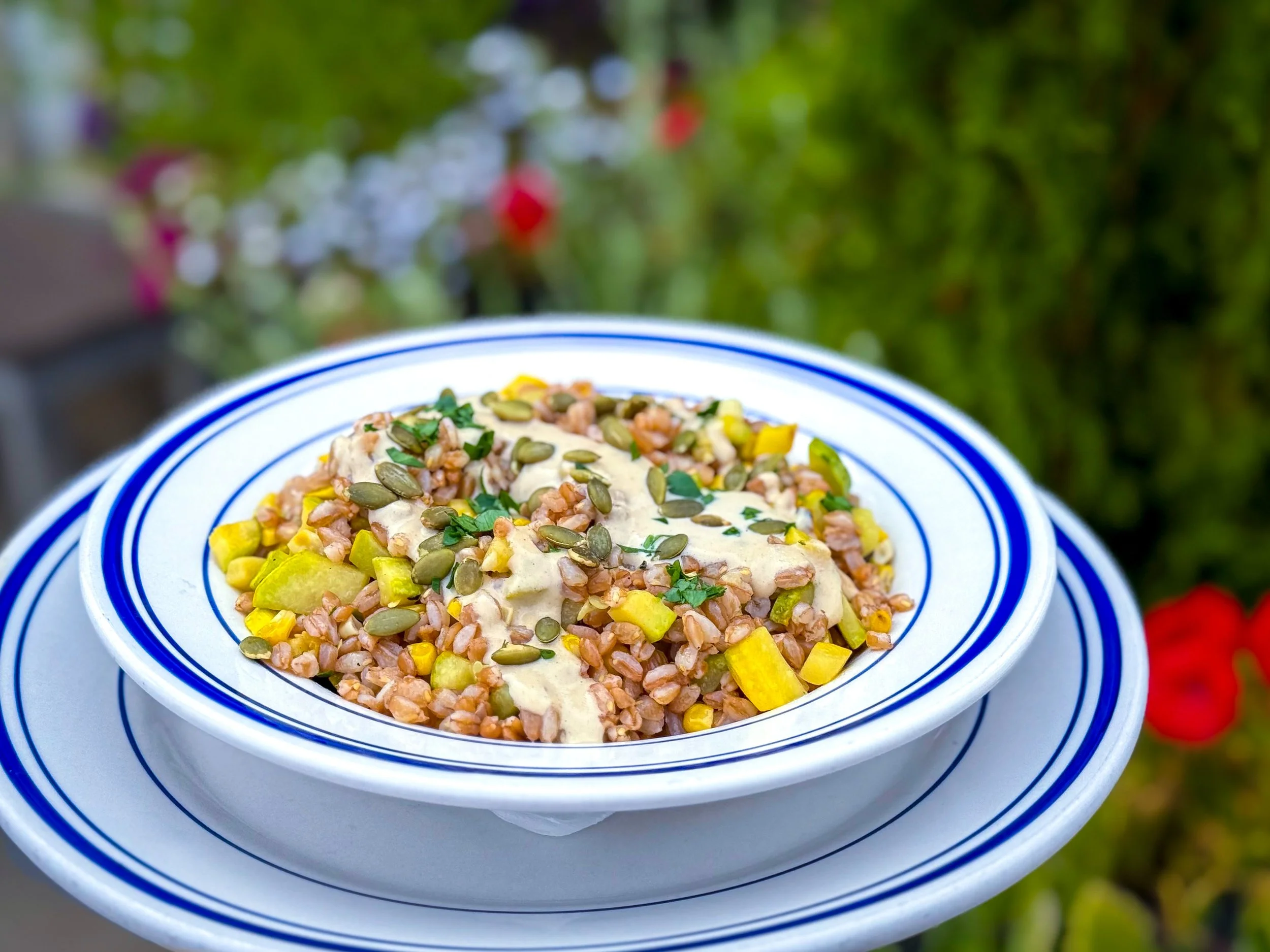 Roast Delicata squash, charred corn, blistered cherry tomatoes and farro, served with a lemon tahini dressing and topped with toasted pumpkin seeds and fresh parsley