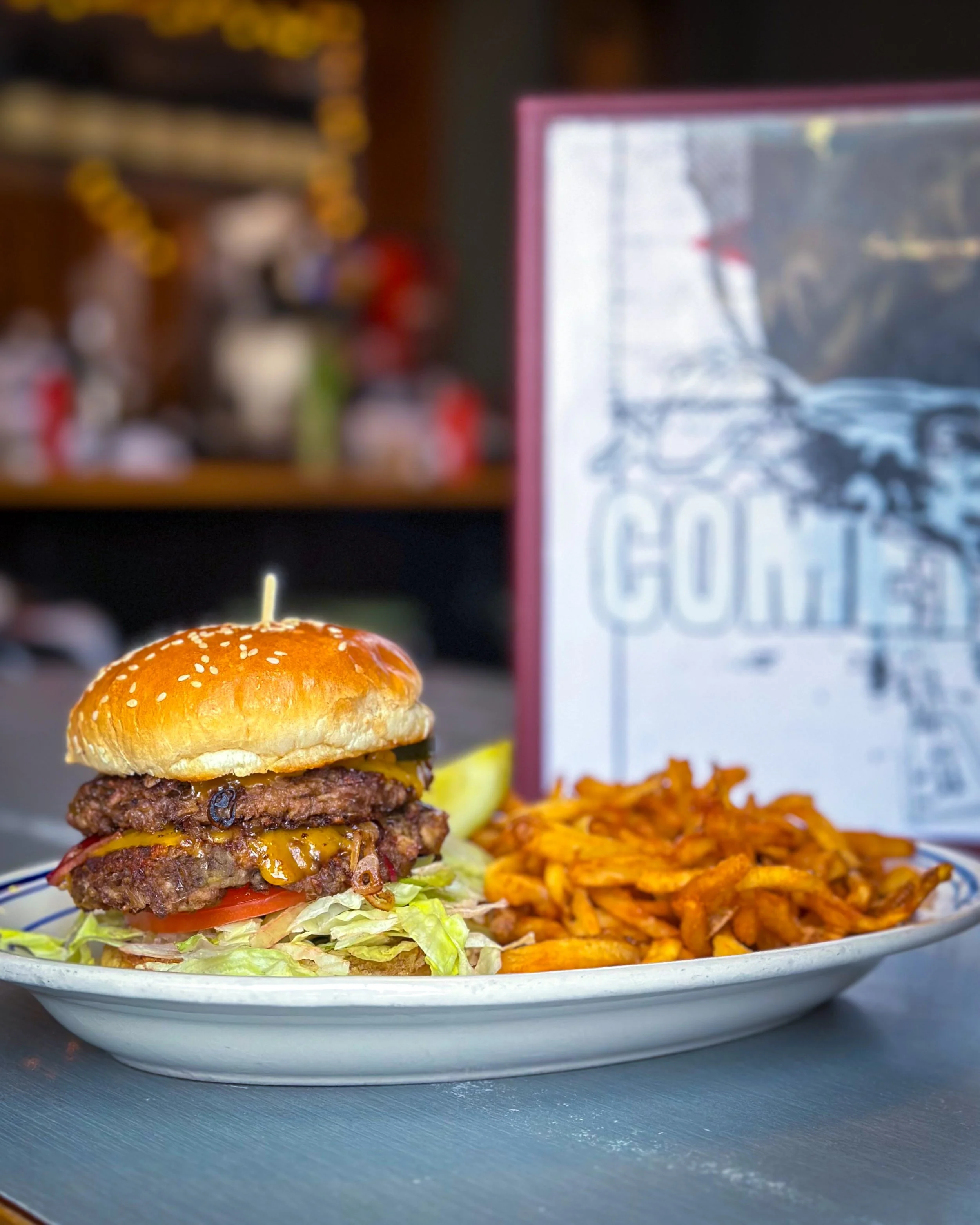 Two smashed beef patties, American cheese, house-made pickles, beer onions, dijonnaise, on salted rye